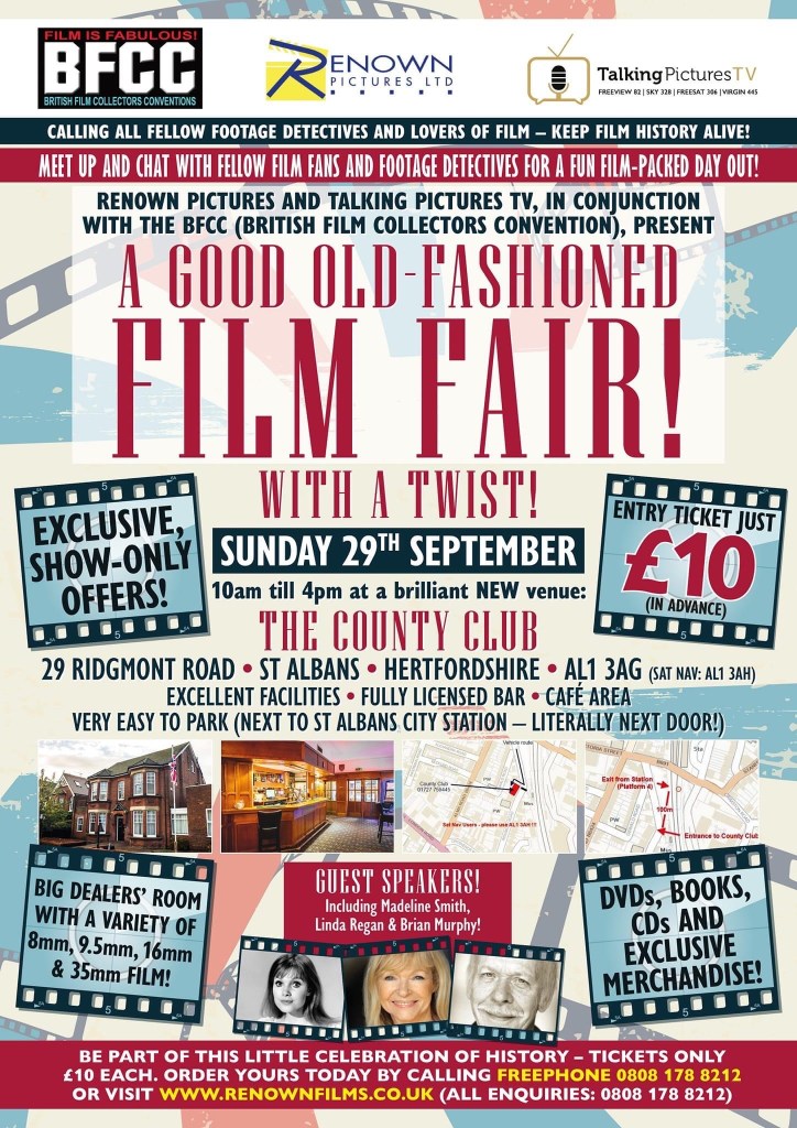 The British Film Collectors Convention has teamed up with Renown Films and Talking Pictures TV to host BFCC Lite: a film fair in St Albans, Hertfordshire on Sunday 29th September.